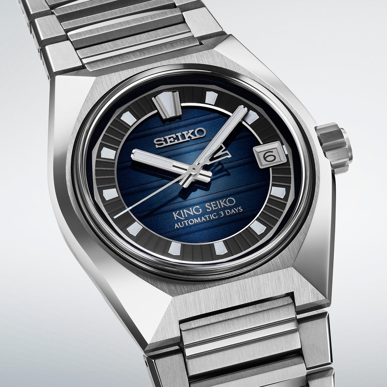 キングセイコーは1961年、東京・亀戸の第二精工舎で誕生しました。本作は、その東京から望む地平線をコンセプトに、ケース、バンド、ダイヤルをデザインしています。金属の塊を削り出したかのような重厚さを持つケースは、ベゼル(ガラス縁)のないデザインにすることで、伸びやかな表情も併せ持っています。また、高度な研磨仕上げにより、歪みのない鏡面に仕上げました。そして、ケースと滑らかにつながる新開発のブレスレットは、鏡面仕上げとヘアライン仕上げのこまを短いピッチで組み合わせ、水平のラインが際立つデザインにするとともに、高級腕時計にふさわしい着け心地を実現しています。