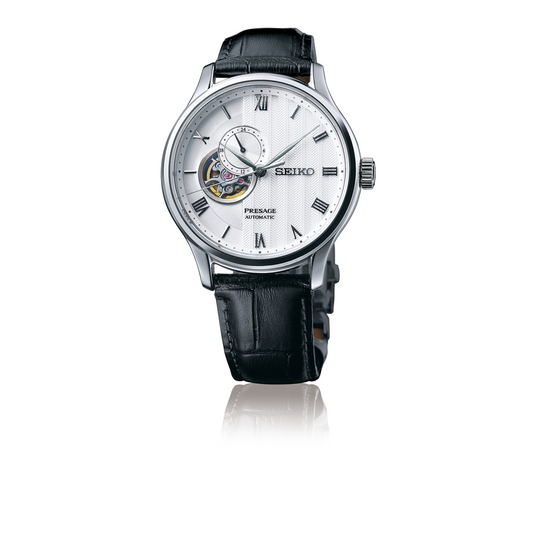 ■ 9時位置のオープンハート部分は、波型と砂目の型打ち仕上げを組み合わせた砂紋をイメージし、そこから覗くムーブメントのルビーを庭石に見立てたデザイン。