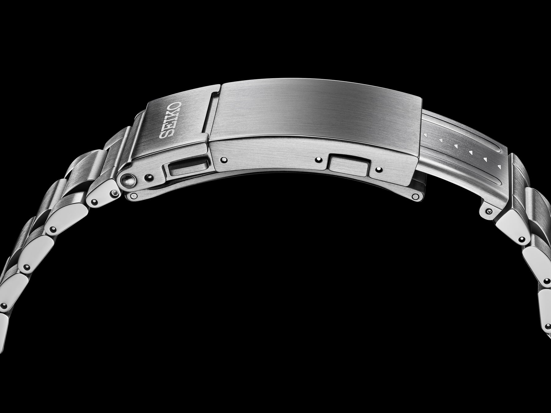 新たに開発した中留は、簡単な操作でブレスレットのサイズ調整が可能です。最大約15mmの調整幅があり、着用した状態で中留を閉じたまま、サイドにあるボタンを両側から押すことで、長さを簡単に伸縮させることができます。調整の幅は約2.5mmずつ、6段階で行うことができます。これにより、潜水時の気圧の変化や、日常生活における腕周りの変化などにも対応ができ、常に快適な着用感を保ちます。