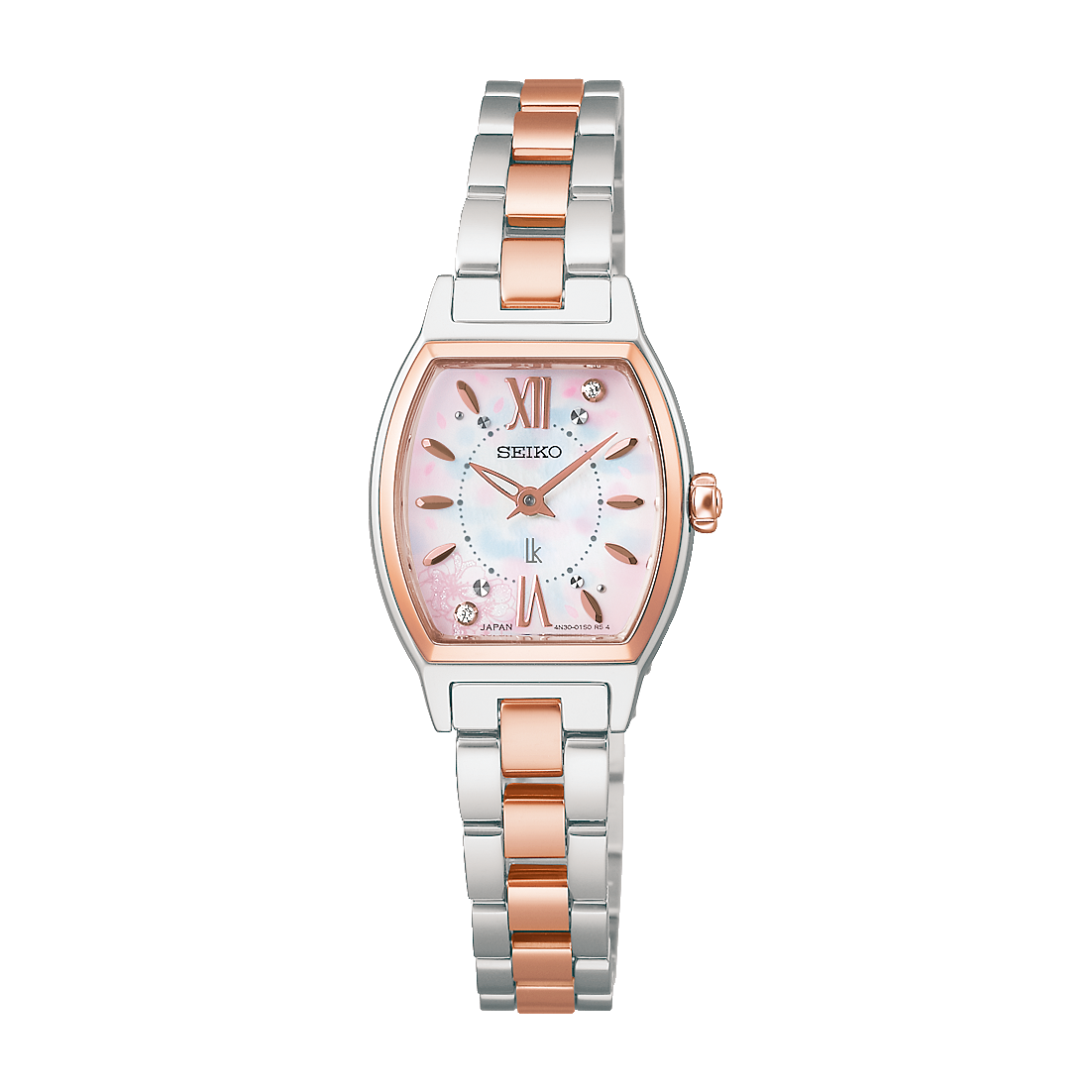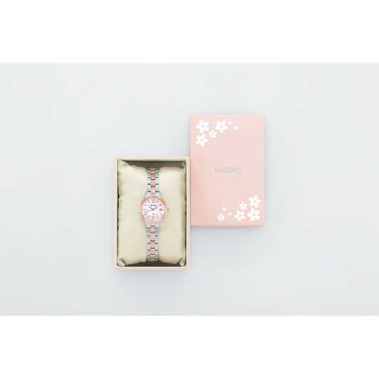 舞い散る桜の花びらと水面にきらめく光をダイヤル外周部に重ね、7時位置にはラメで繊細に輝く八重桜をあしらい、静かな華やぎを添えました。