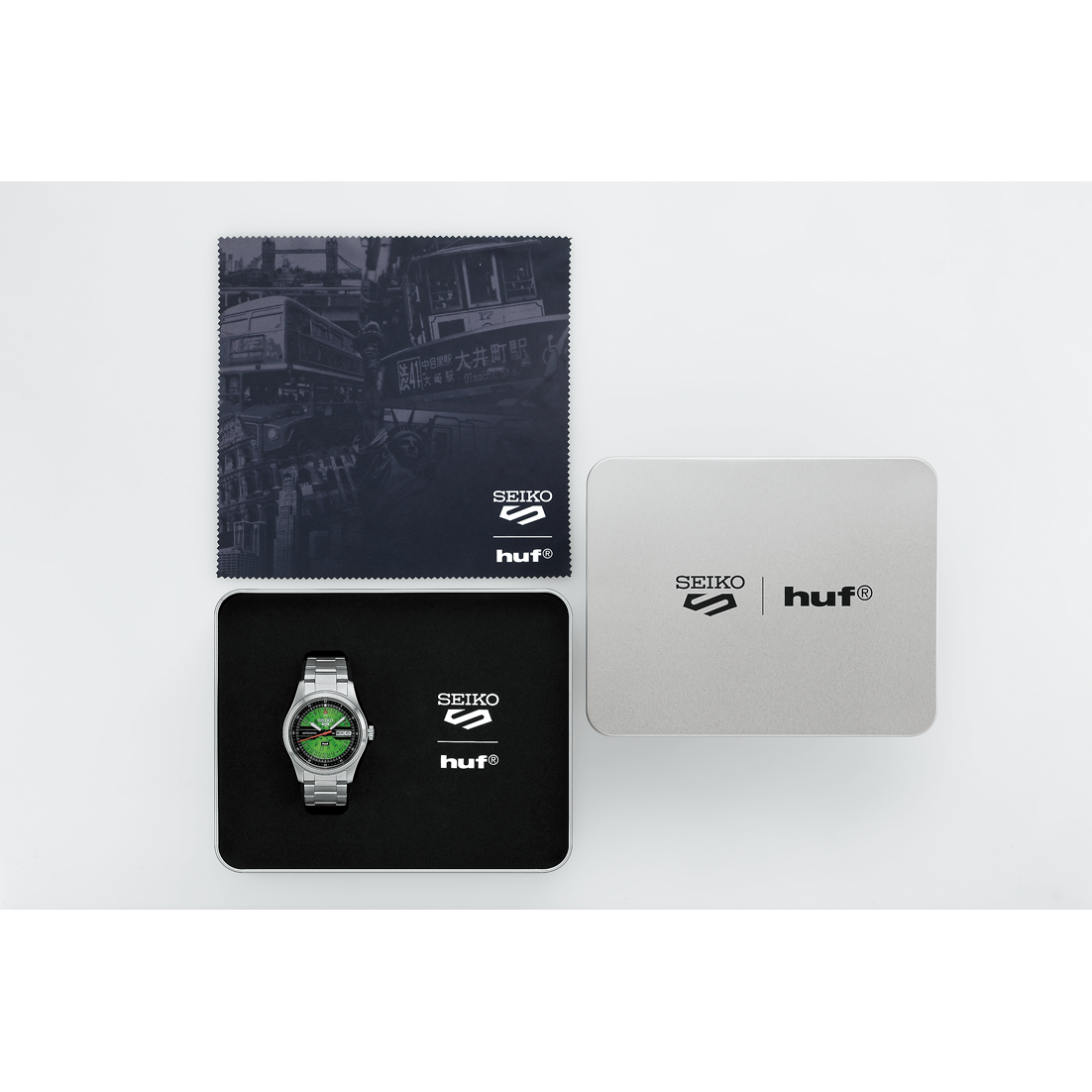 シースルーバック仕様の裏ぶたは、ダイヤルと同じく「HUFグリーン」を採用し、サンフランシスコのシティパターンの線画を入れました。
