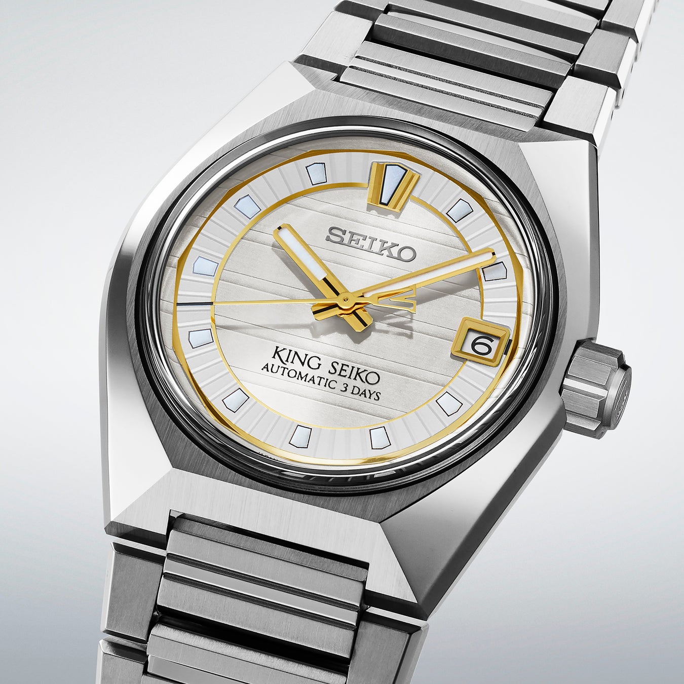 キングセイコーは1961年、東京・亀戸の第二精工舎で誕生しました。本作は、その東京から望む地平線をコンセプトに、ケース、バンド、ダイヤルをデザインしています。金属の塊を削り出したかのような重厚さを持つケースは、ベゼル(ガラス縁)のないデザインにすることで、伸びやかな表情も併せ持っています。また、高度な研磨仕上げにより、歪みのない鏡面に仕上げました。そして、ケースと滑らかにつながる新開発のブレスレットは、鏡面仕上げとヘアライン仕上げのこまを短いピッチで組み合わせ、水平のラインが際立つデザインにするとともに、高級腕時計にふさわしい着け心地を実現しています。