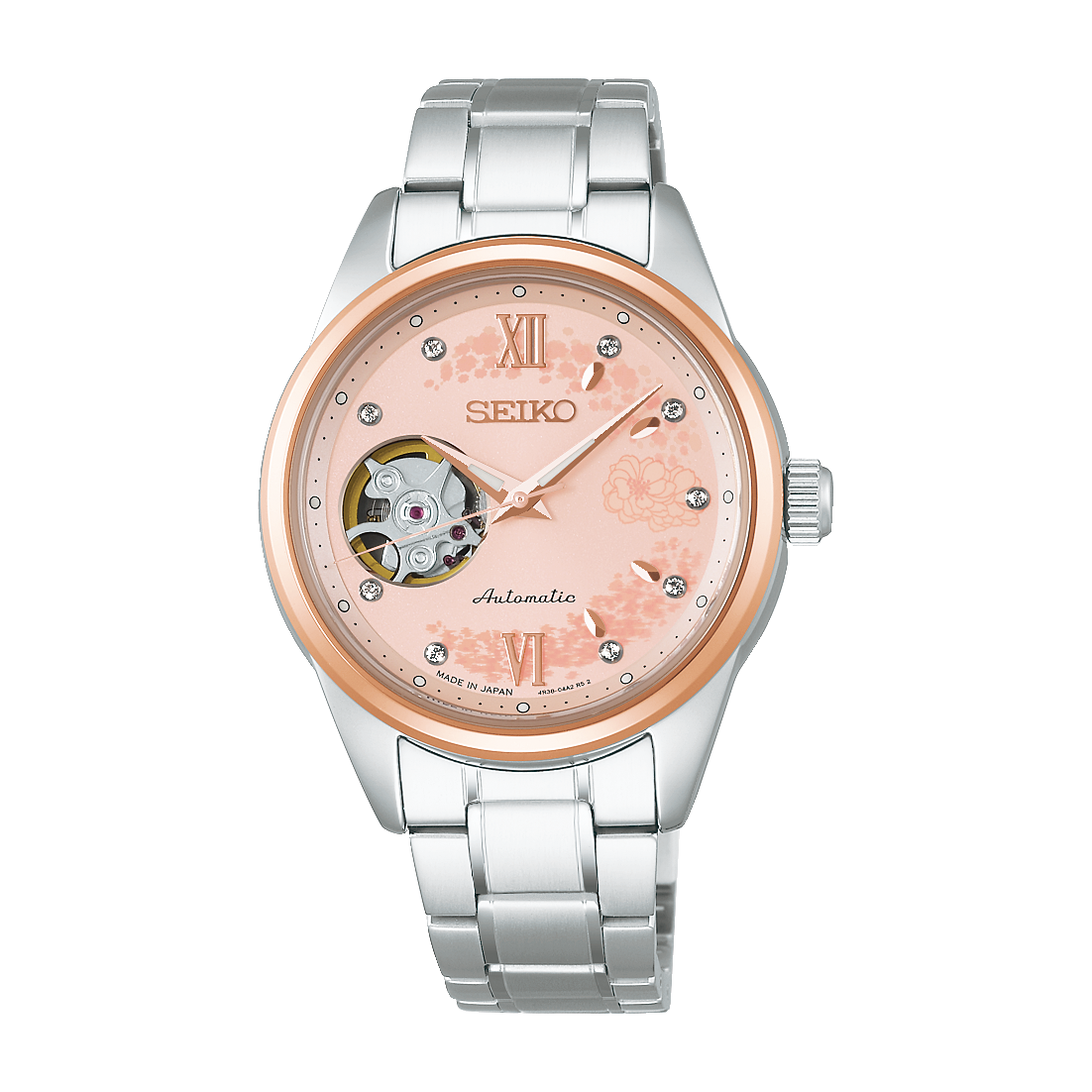 SCVE064と同じサーモンピンクのダイヤルをベースに、上部には咲き誇る八重桜を、下部には水面に映る桜の情景をモザイク調で表現しました。